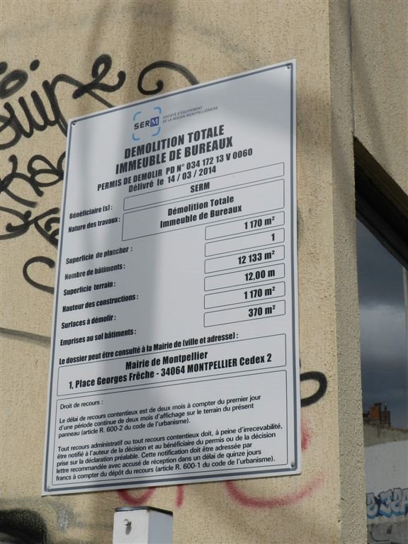 Panneau du permis de démolir des anciens bureaux du Sernam de Montpellier, photographié le vendredi 11 avril 2014. Copyright : Anje34