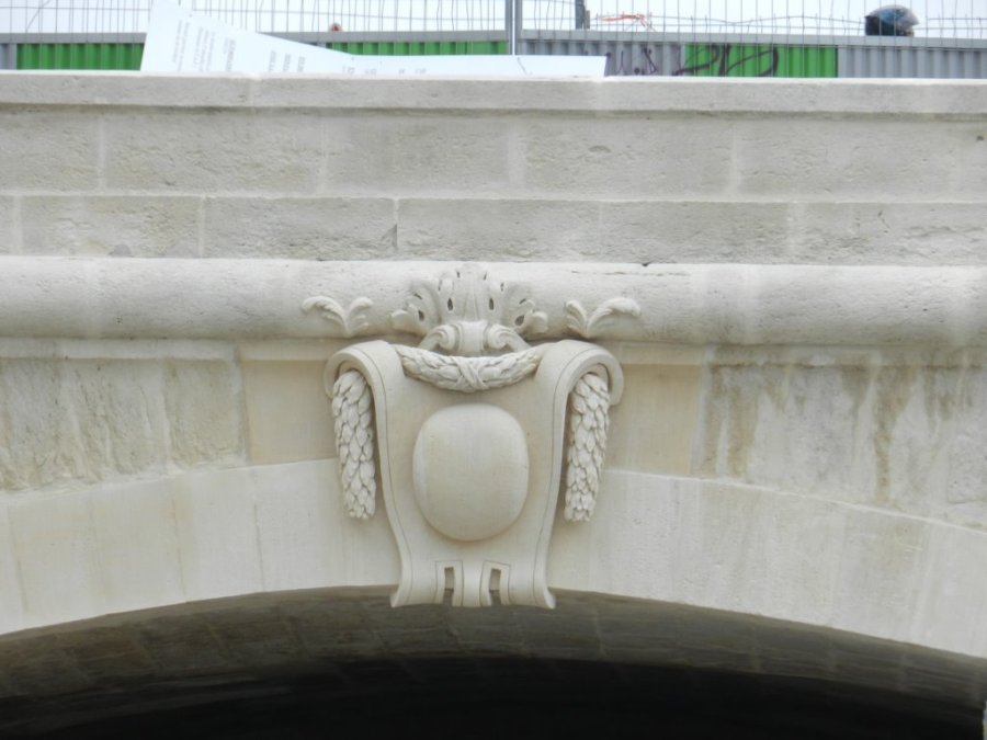 Photographie du blason placé sur la pierre de voûte de la face nord du pont Vialleton en cours de restauration, prise le mardi 24 mars 2015. Copyright : Anje34