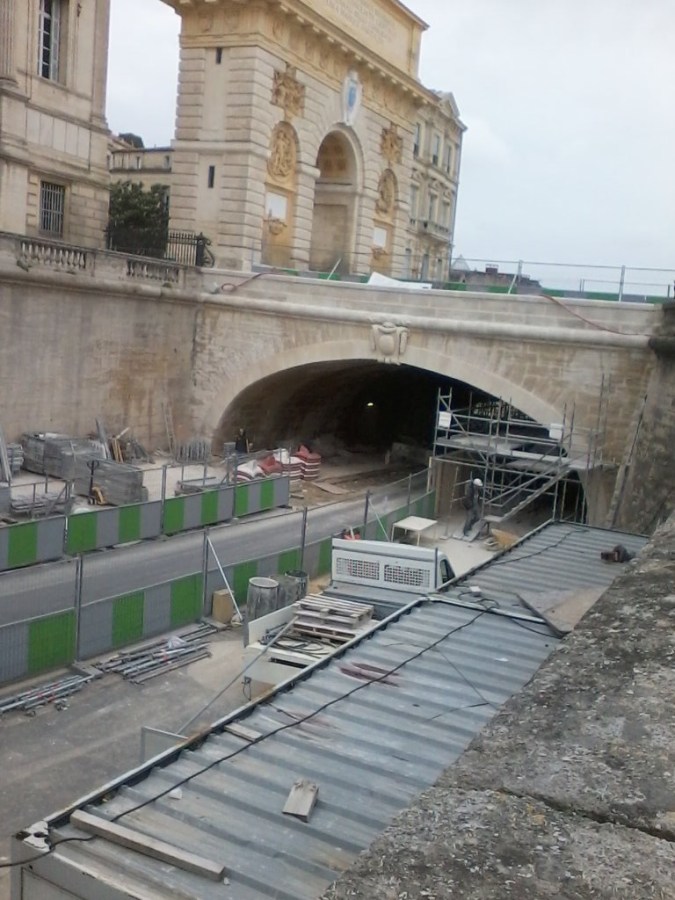 La face nord restaurée du pont Vialleton à découvert. C’est au pied de la face nord de cet ouvrage d’art de la fin du XVIIème siècle que sera construite la future station « Peyrou – Arc de Triomphe » de la ligne 4 en cours de bouclage. Photo prise le mardi 24 mars 2015. Copyright : Anje34