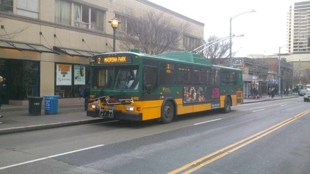 A Seattle, le trolleybus standard 4192 opérant sur la ligne 2 est photographié à un arrêt situé sur la 3ème avenue à l’angle de Virginia Street, le mercredi 25 mars 2015. Copyright : DS7