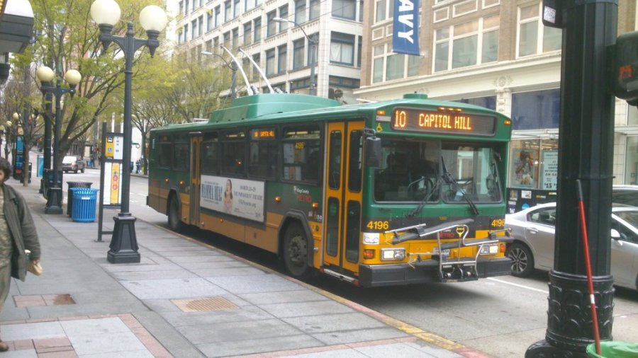 A Seattle, le trolleybus standard 4196 opérant sur la ligne 10 est photographié à la hauteur du 514 Pine Street, le mercredi 25 mars 2015. Copyright : DS7