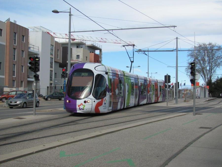 Ligne 2 de tramway, la rame 2049 Citadis 302 Alstom multiligne aux couleurs de Montpellier Méditerranée Métropole, quitte le terminus « Saint-Jean-de-Védas – Centre » à destination du terminus « Jacou », le samedi 28 mars 2015. Copyright : Edouard Paris