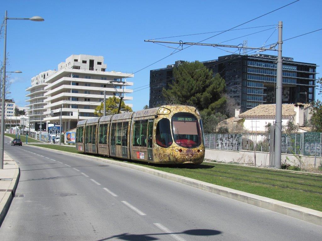 Sur la ligne 4, inaugurée le vendredi 6 avril 2012, la rame 2044 Citadis 302 Alstom est photographiée sur l’avenue Germaine Tillion entre les stations « Georges Frêche – Hôtel de Ville » et « La Rauze », le mercredi 1er avril 2015. Copyright : Edouard Paris