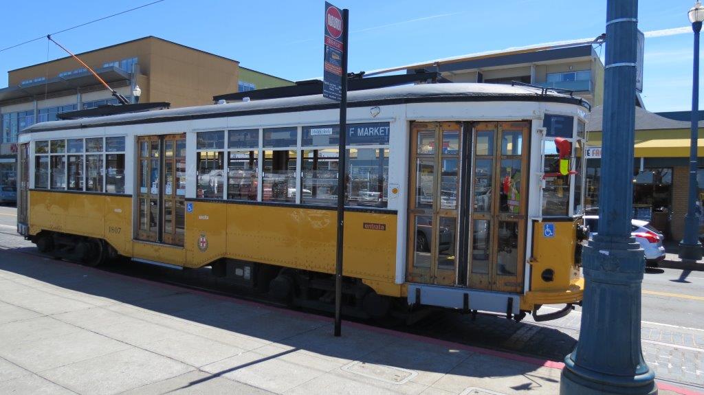 Motrice Peter Witt Class numérotée 1807 aux couleurs de son réseau d’origine, Milan (Italie), photographiée sur la boucle à voie unique de la ligne F à la hauteur du 52 Jefferson Street, quartier Fisherman’s Wharf à San Francisco, le mardi 14 avril 2015. Copyright : DS7