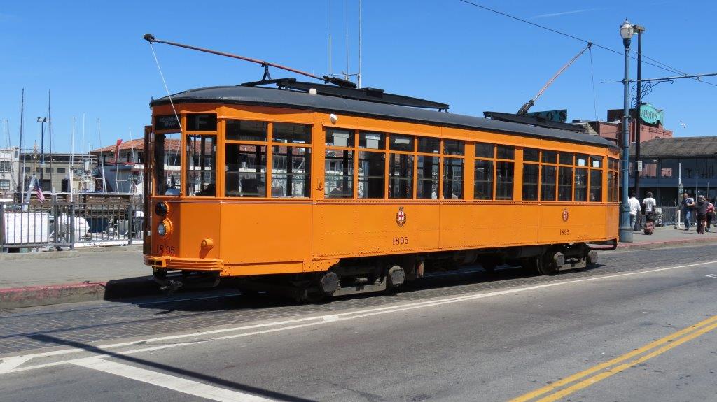 Motrice Peter Witt Class numérotée 1895 revêtue de la livrée orange de son réseau d’origine, Milan (Italie), photographiée sur la boucle à voie unique de la ligne F à la hauteur du 260 Jefferson Street, quartier Fisherman’s Wharf à San Francisco, le mardi 14 avril 2015. Copyright : DS7