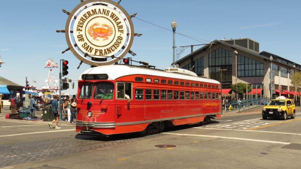 Motrice PCC 1050 Class numérotée 1061 revêtue de la livrée Pacific Electric, photographiée sur la boucle à voie unique de la ligne F à la hauteur du 204 Jefferson Street, quartier Fisherman’s Wharf à San Francisco, le mardi 14 avril 2015. Copyright : DS7