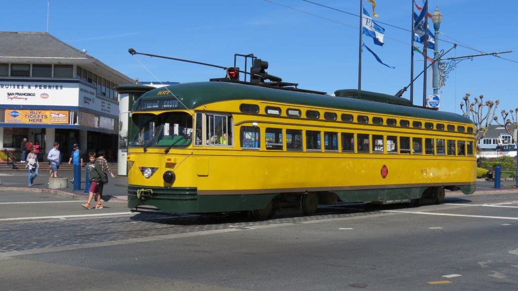 Motrice PCC 1070 Class numérotée 1071 revêtue de la livrée Minneapolis-Saint Paul, Minnesota, photographiée sur la boucle à voie unique de la ligne F à la hauteur du 6 Jefferson Street, quartier Fisherman’s Wharf à San Francisco, le mardi 14 avril 2015. Copyright : DS7