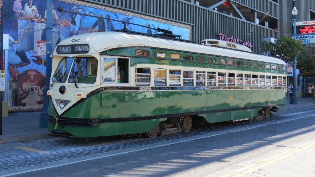 Motrice PCC 1050 Class numérotée 1062 revêtue de la livrée Louisville, Kentucky, photographiée sur la boucle à voie unique de la ligne F à la hauteur du 2824 Jones Street, quartier Fisherman’s Wharf à San Francisco, le mardi 14 avril 2015. Copyright : DS7