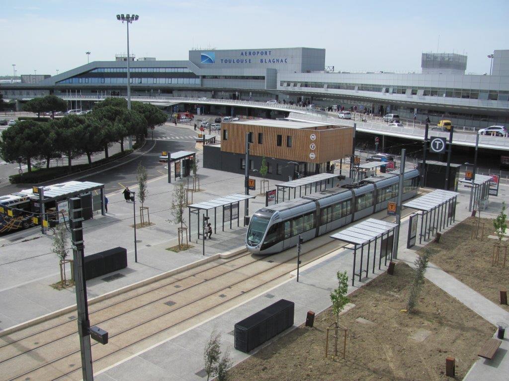 Vue du terminus T2 « Aéroport » et d’une partie de l’aérogare de Toulouse Blagnac, le mercredi 15 avril 2015. Copyright : Edouard Paris