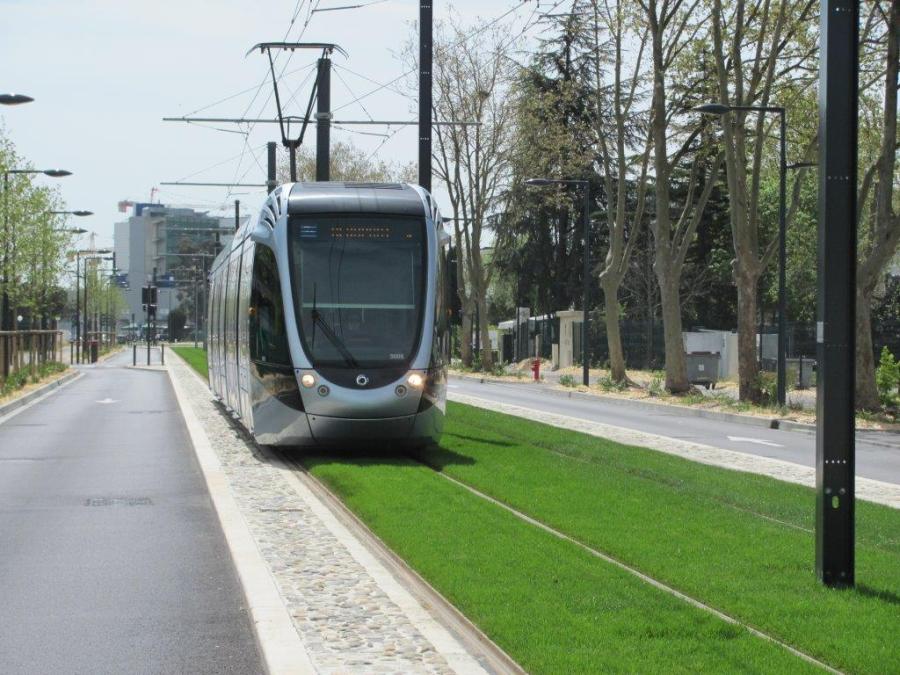 A Blagnac, ligne Envol T2, la rame 5005 Citadis 302 Alstom roule en direction du terminus « Aéroport » sur plateforme engazonnée, entre les stations « Nadot » et « Daurat », le mercredi 15 avril 2015. Copyright : Edouard Paris