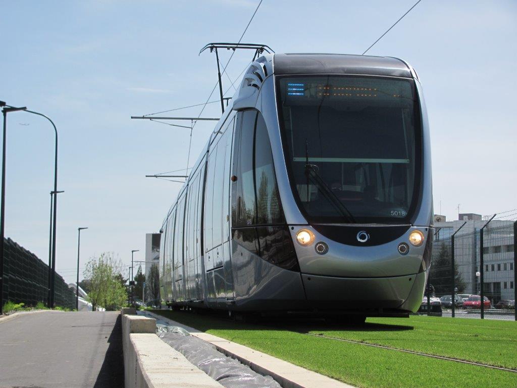 A Blagnac, ligne Envol T2, la rame 5018 Citadis 302 Alstom est photographiée alors qu’elle circule sur une plateforme recouverte de gazon synthétique en direction du terminus « Aéroport », avant la station « Nadot », le mercredi 15 avril 2015 . Copyright : Edouard Paris