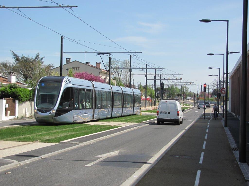 Avenue Latécoère à Blagnac, sur la ligne Envol T2, la rame 5007 Citadis 302 Alstom est photographiée à la hauteur de la nouvelle cuisine centrale, le mercredi 15 avril 2015. Copyright : Edouard Paris