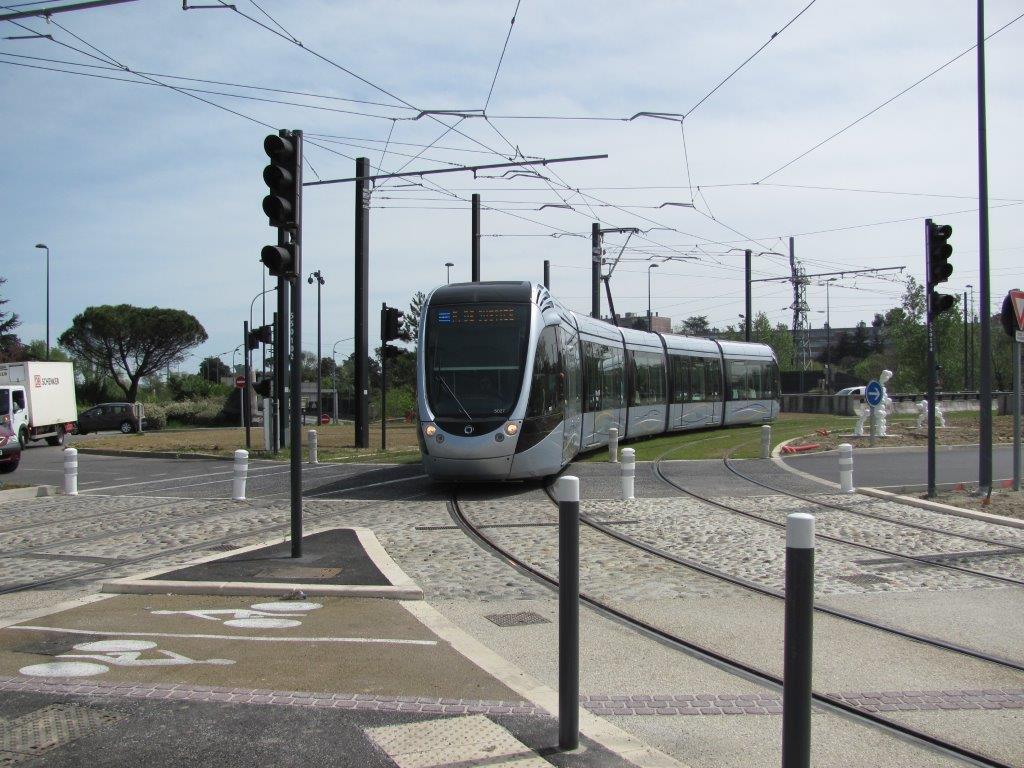 A Blagnac, au rond-point Jean-Maga, la rame 2027 Citadis 302 Alstom prend la direction du terminus « Aéroport » T2, le mercredi 15 avril 2015, alors que sa girouette indique par erreur « Palais de Justice ». Copyright : Edouard Paris
