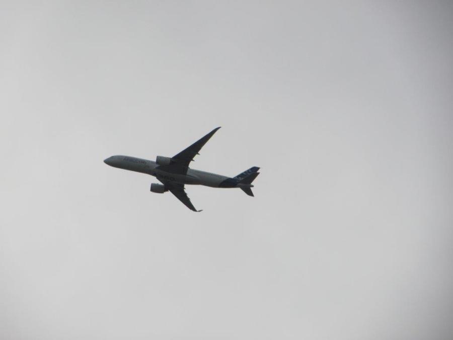Le tout premier Airbus A350 identifié F-WXWB dont le premier vol d’essai a eu lieu le 14 juin 2013, est photographié quelques secondes après son décollage de Toulouse Blagnac, le mercredi 15 avril 2015. Copyright : Edouard Paris
