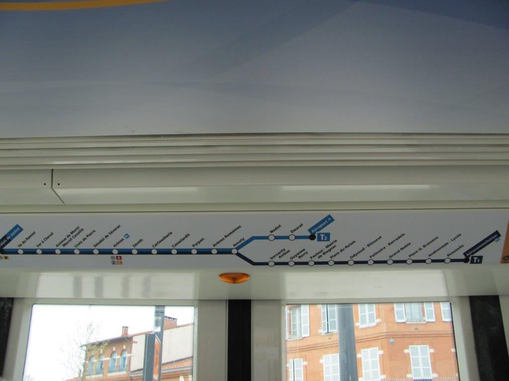 Plan des lignes T1 et T2 photographié à bord d’une rame Citadis 302 Alstom au terminus « Palais de Justice » T1 T2 à Toulouse, le mercredi 15 avril 2015. Copyright : Edouard Paris