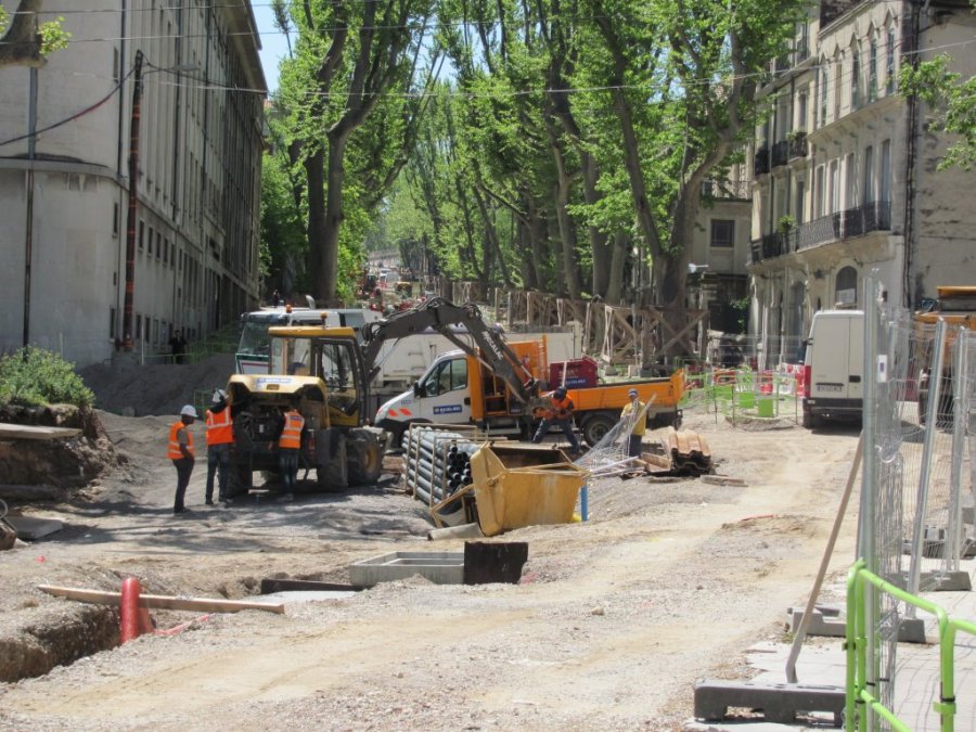 Travaux en cours dans le cadre du bouclage de la ligne 4 de tramway, place Albert 1er à Montpellier, le mardi 21 avril 2015. Copyright : Edouard Paris