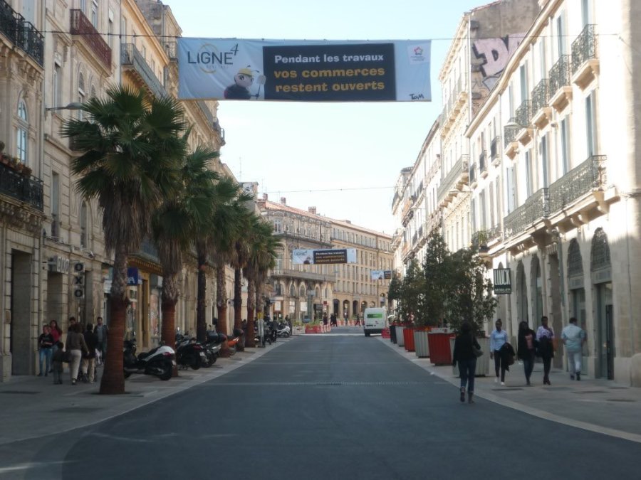 Le vendredi 10 avril 2015, trois banderoles « Pendant les travaux vos commerces restent ouverts » flottaient au vent, dont deux boulevard du Jeu-de-Paume, entre la rue André-Michel et la rue du Faubourg-du-Courreau, et une au début du boulevard Ledru-Rollin. Copyright : Edouard Paris