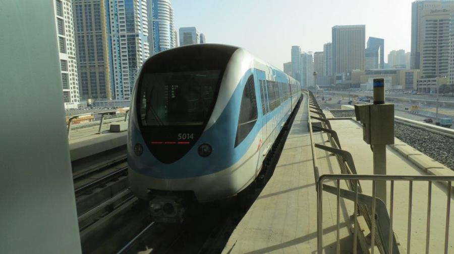 A Dubaï, la rame 5014 Kinky Shario quitte la station « Damac properties metro station » sur la ligne rouge, en direction du terminus « Jebel Ali », le mardi 21 avril 2015. Copyright : DS7