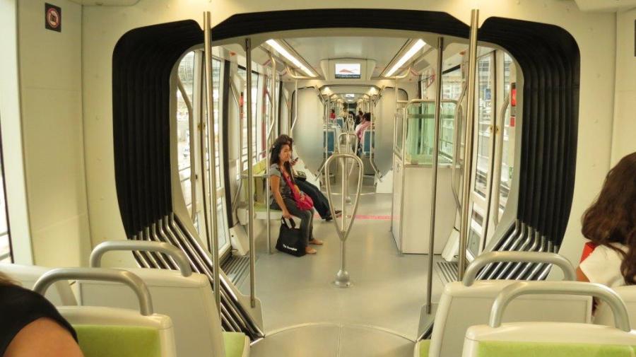 Aménagements intérieurs d’une rame Citadis 402 Alstom du tramway de Dubaï. Photo prise depuis la section réservée aux femmes et enfants, le mardi 21 avril 2015. Copyright : DS7