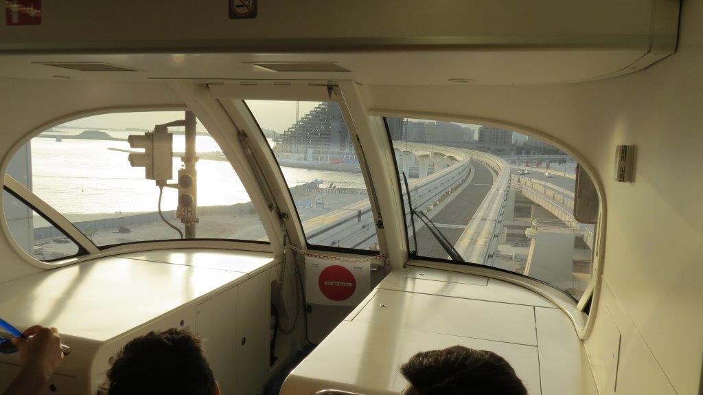 Photographie prise à l’avant d’une rame de monorail triple caisse Hitachi sur la ligne Palm Jumeirah à Dubaï, le mardi 21 avril 2015. Copyright : DS7