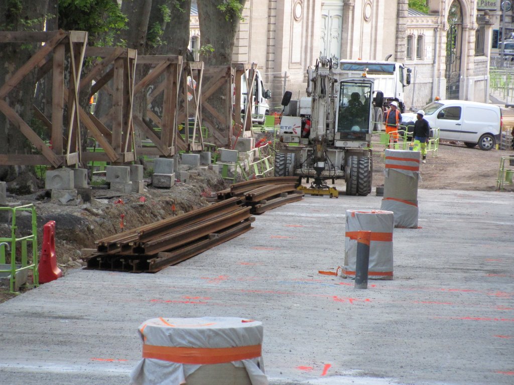Un engin rail-route de la société ETF, filiale d’Eurovia (groupe Vinci) a déchargé puis déposé les premiers rails destinés au bouclage de la ligne 4, au bas du boulevard Henri IV, à la hauteur de la future station « Albert 1er – Cathédrale », le jeudi 23 avril 2015. Copyright : Edouard Paris