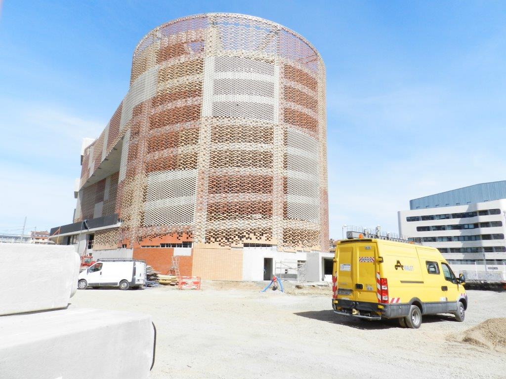 Au pied de la tour abritant la rampe hélicoïdale d’accès aux niveaux du futur parking silo Le Nouveau Saint-Roch, le revêtement mural est composé de centaines de petits carreaux rectangulaires en harmonie avec la couleur des briques de céramique. Photo prise le vendredi 3 avril 2015. Copyright : Anje34