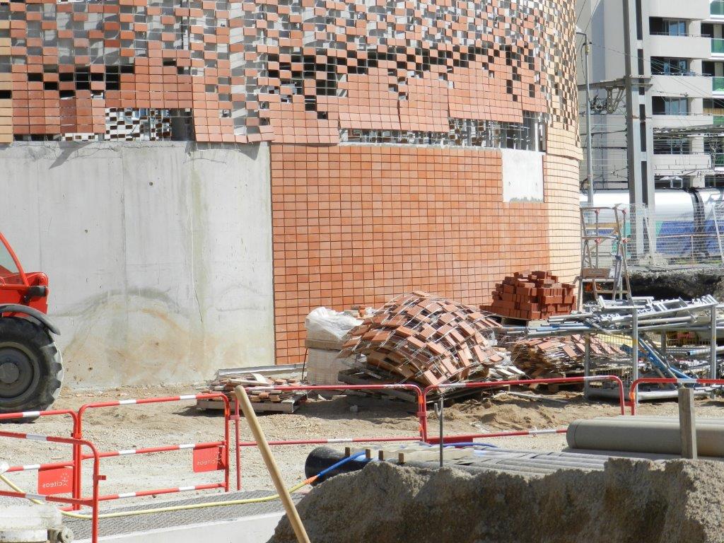 A Montpellier, futur parking silo Le Nouveau Saint-Roch, le vendredi 3 avril 2015, il restait encore des surfaces à recouvrir de petits carreaux. Un travail qui nécessite une grande patience. Copyright : Anje34