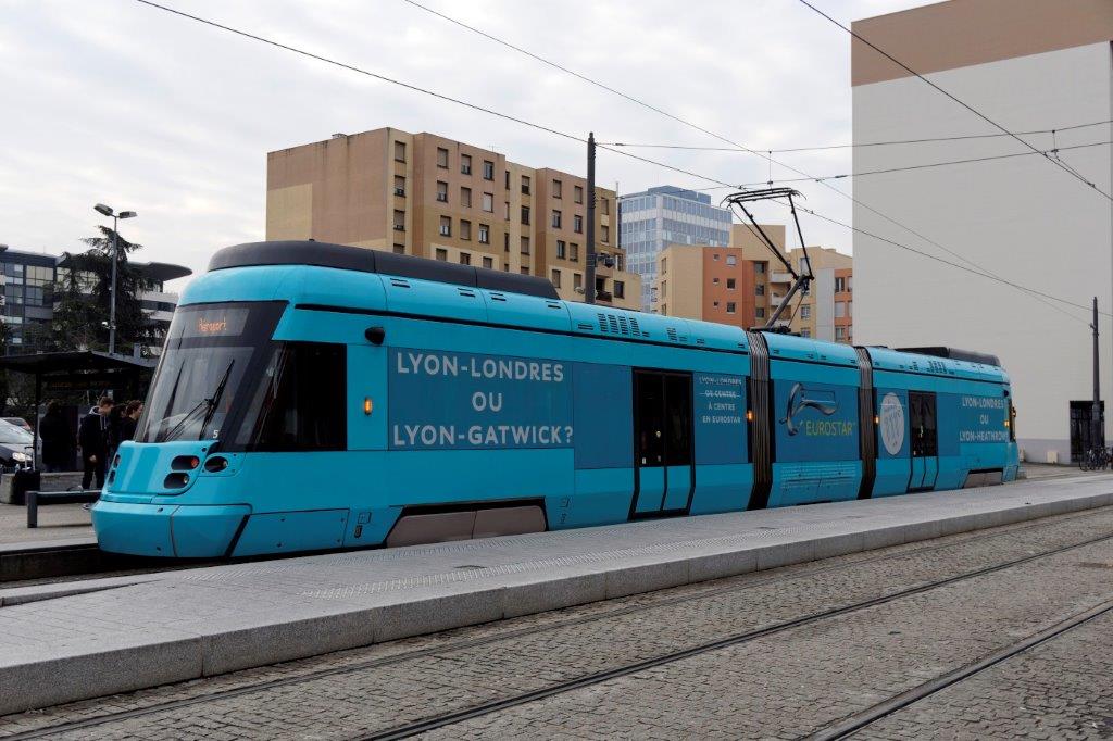 A Lyon, la rame 105 Tango Stadler, revêtue d’un pelliculage publicitaire Eurostar, est photographiée au terminus « Gare Part-Dieu Villette » de la ligne rhônexpress, le jeudi 26 mars 2015. Copyright : Yvon Brument