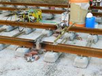 - A Montpellier, au bas du boulevard Henri IV, les traverses bi-blocs sont alignées avant que les rails soient posés dessus puis fixés préalablement ou postérieurement à leur soudure. Photo prise le mardi 28 avril 2015. Copyright : Anje34