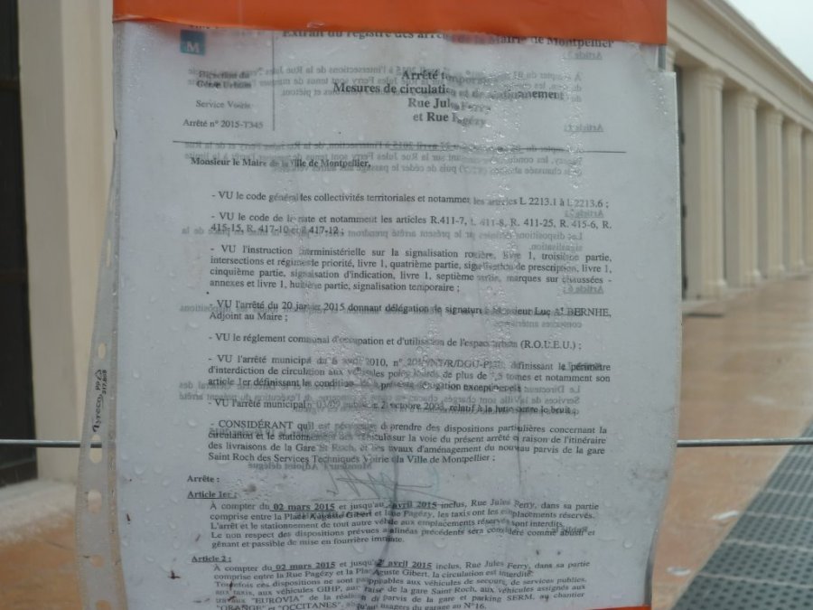 Arrêté municipal 2015-T345 dont les dispositions sont applicables du lundi 2 mars au lundi 27 avril 2015. Photo prise le lundi 27 avril 2015. Copyright : Edouard Paris