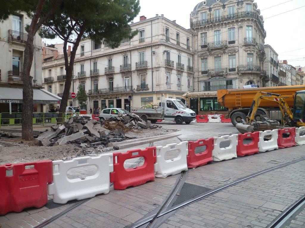 Chantier en rapport avec le bouclage de la ligne 4 de tramway, place Edouard-Adam à Montpellier, le mercredi 29 avril 2015. Copyright : Edouard Paris