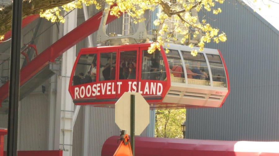 Zoom sur la cabine South du tramway aérien de New York City Roosevelt Island à l’approche de la station située sur Roosevelt Island, le vendredi 1er mai 2015. Copyright : DS7