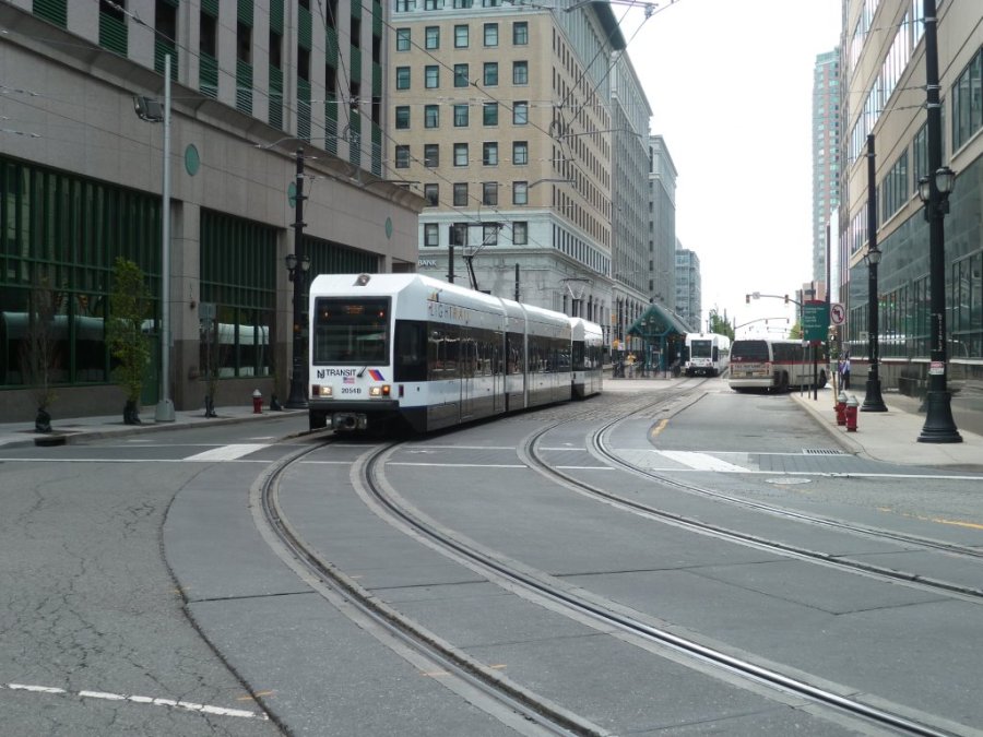 Hudson Street à Jersey City où circulent les rames du constructeur japonais Kinki Sharyo opérant sur le réseau Hudson-Bergen Light Rail. Photo prise le jeudi 5 mai 2011. Copyright : Edouard Paris