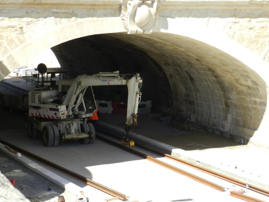 Un engin rail-route de l’entreprise ETF place les rails destinés au bouclage de la ligne 4 de tramway sous le pont Vialleton à Montpellier, le mercredi 6 mai 2015. Copyright : Anje34