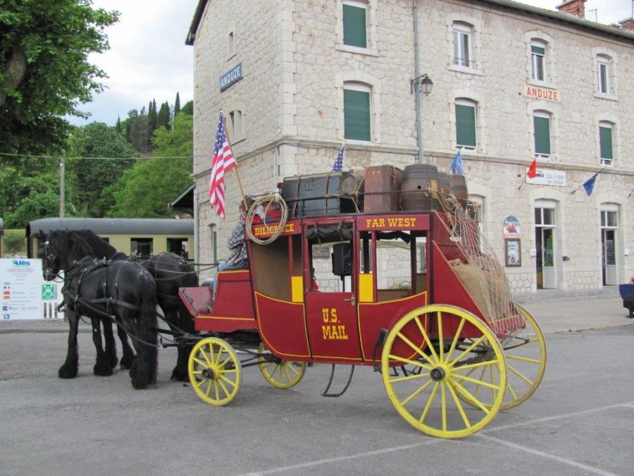 Une diligence sortie tout droit d’un film de Far West stationne devant la gare du Train à Vapeur des Cévennes à Anduze, le vendredi 8 mai 2015. Copyright : Edouard Paris