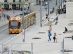 - Une rame fleurie Citadis 302 Alstom longe la première tranche ouverte aux piétons du nouveau parvis de la gare Saint-Roch à Montpellier, le vendredi 8 mai 2015. Copyright : Anje34