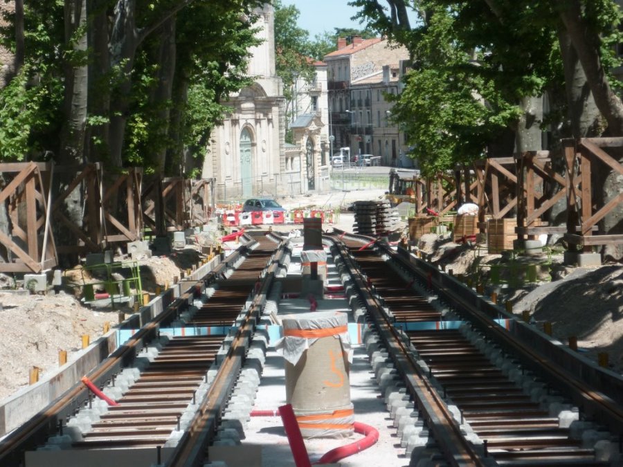 Sur la photo prise le dimanche 10 mai 2015, l’emplacement de la future station de la ligne 4 située sur la partie basse du boulevard Henri IV à Montpellier est délimité par deux points de repère de forme cylindrique, l’un au premier plan et l’autre dans l’ombre juste avant la légère courbure des voies en direction de la place Albert 1er. Copyright : Edouard Paris