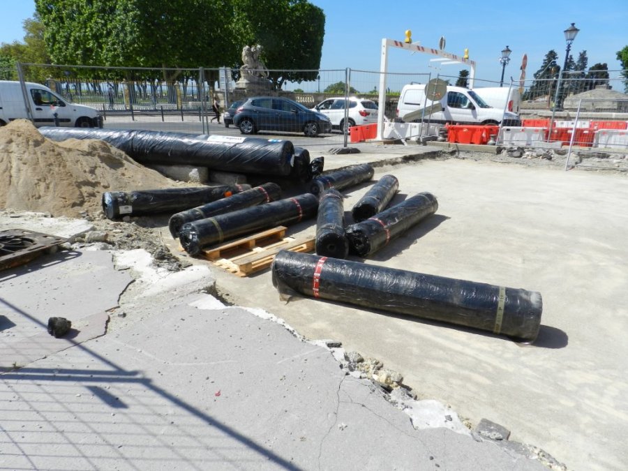 Sur le pont Vialleton qui relie la rue Foch aux Jardins du Peyrou, le sol a été compacté avant la pose d’un tissu « géotextile » qui assurera l’étanchéité de la partie supérieure de l’ouvrage. Photo prise le mardi 12 mai 2015. Copyright : Anje34