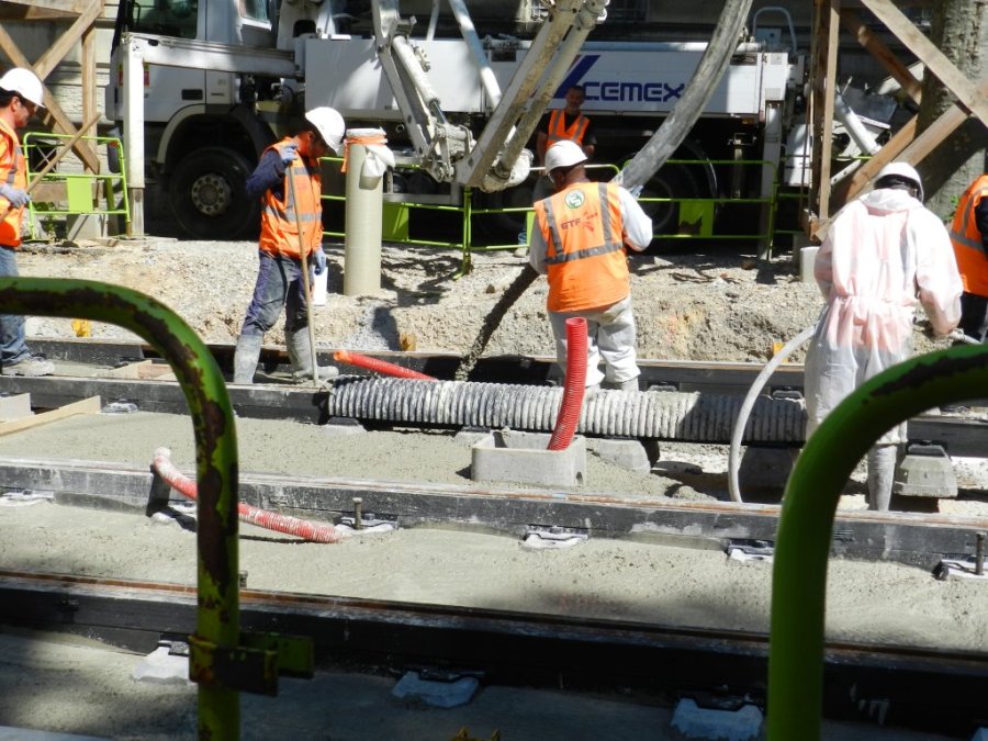 Sur la partie basse du boulevard Henri IV à Montpellier, du béton est en train d’être coulé le long des voies pour sceller définitivement les traverses bi-blocs supportant les rails à la plateforme. Photo prise le mardi 12 mai 2015. Copyright : Anje34