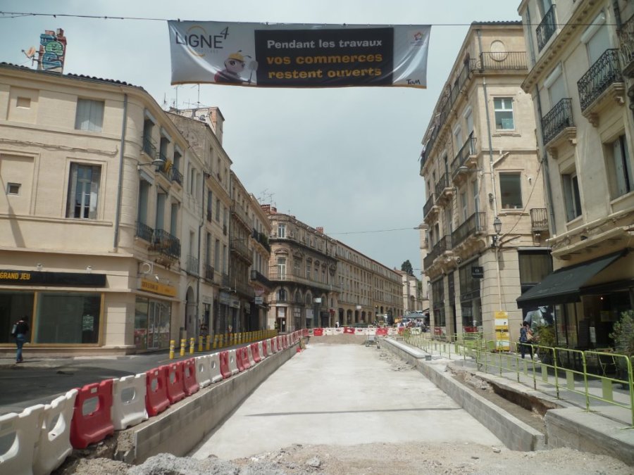 Aperçu du chantier de bouclage de la ligne 4 de tramway sur le boulevard du Jeu-de-Paume à Montpellier, entre les rues Marceau et Faubourg-du-Courreau, le mercredi 13 mai 2015. Copyright : Edouard Paris
