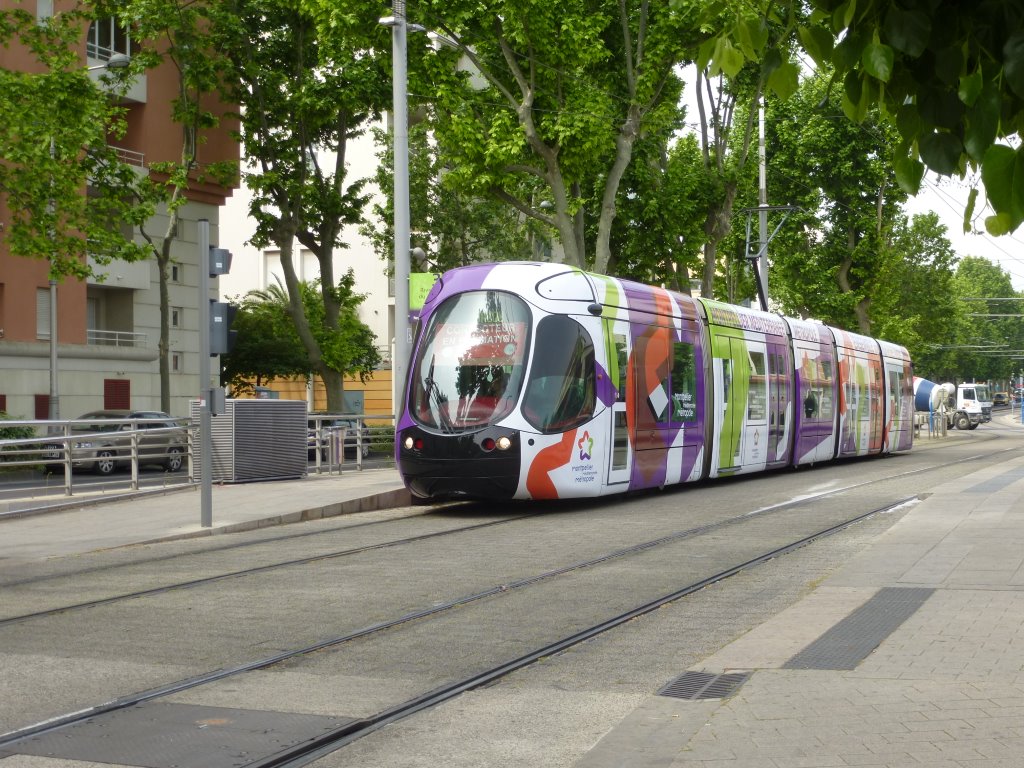 La rame 2049 Citadis 302 Alstom multiligne aux couleurs de Montpellier Méditerranée Métropole sera-t-elle de sortie le samedi 16 mai 2015, jour où de fortes perturbations sont attendues à la suite d’un appel à la grève du syndicat FO TaM ? Photo prise le marcredi 13 mai 2015 à la station « Rives du Lez » de la ligne 3. Copyright : Louis Ferdinand