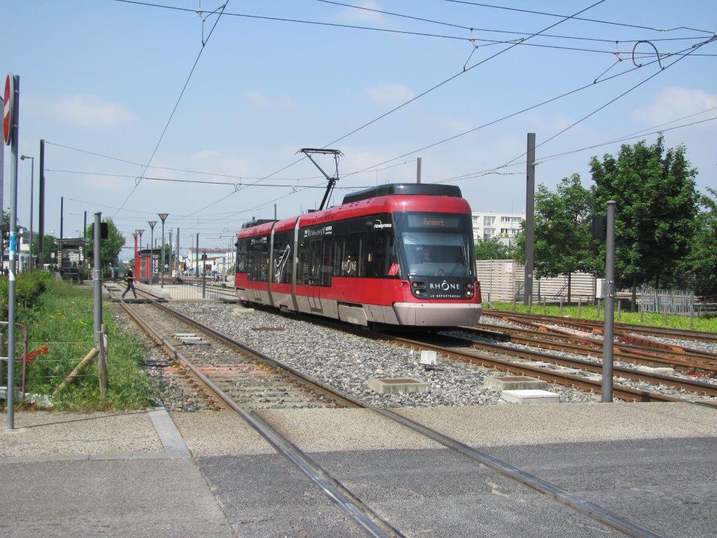 La rame 103 Tango Stadler rhônepress quitte la station « Vaulx-en-Velin La Soie » en direction de l’aéroport internation de Lyon Saint-Exupéry, le samedi 16 mai 2015. Copyright : Edouard Paris