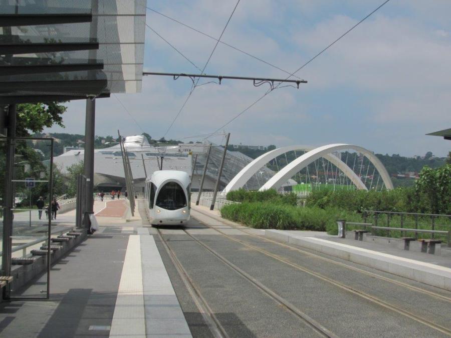 La rame 848 Citadis 302 Alstom approche de la station du T1 « Halle Tony Garnier ». En arrière plan : le pont Raymond-Barre à droite et le Musée des Confluences au centre. Photo prise le samedi 16 mai 2015. Copyright : Edouard Paris