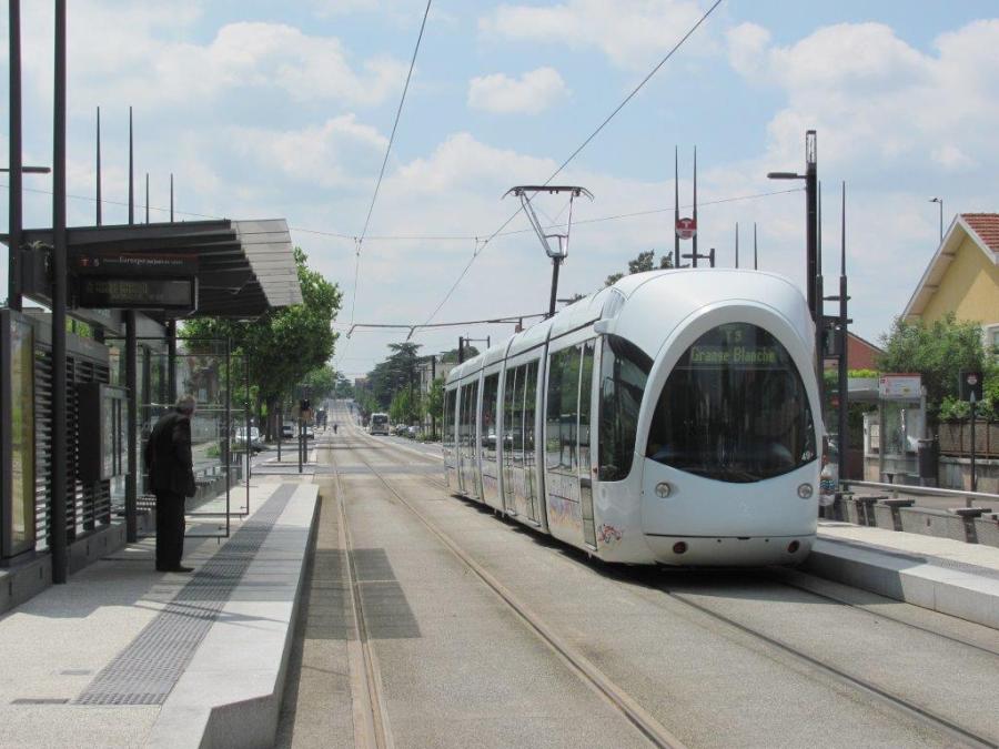 La rame 849 Citadis 302 Alstom est photographiée à la station « Parc du Chêne » du T5, commune de Bron, le samedi 16 mai 2015. Copyright : Edouard Paris