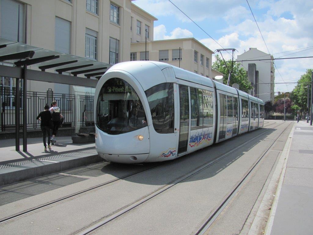 La rame 805 Citadis 302 Alstom, opérant sur le T2, arrive à la station « Grange Blanche » commune aux lignes T2 et T5 dont c’est le terminus pour cette dernière. Photo prise le samedi 16 mai 2015. Copyright : Edouard Paris