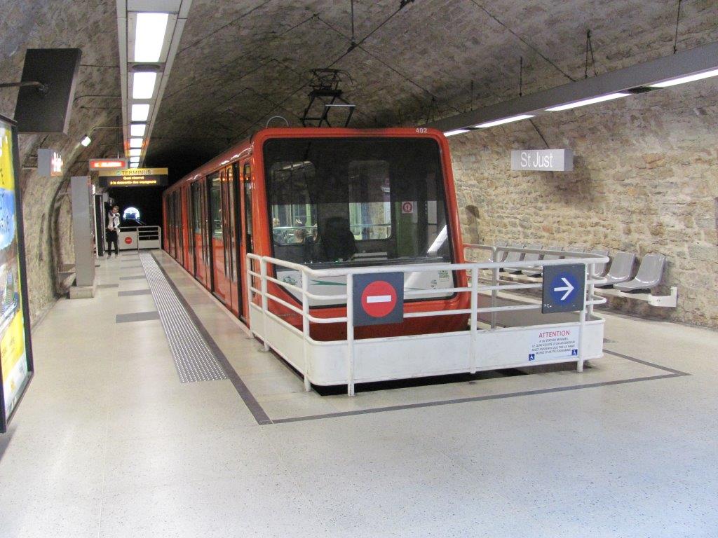 La rame bicaisse 401-402 du funiculaire « Vieux Lyon » – « Saint-Just », de type Saint-Just Skirail/Von Roll, est photographiée à la station supérieure « Saint-Just », le samedi 16 mai 2015. Copyright : Edouard Paris