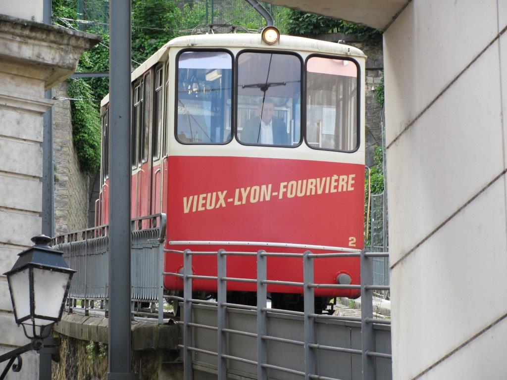 La rame mono-caisse numéro 2 du funiculaire « Vieux Lyon » – « Fourvière », de type Fourvière Von Roll, est photographiée à l’approche de la station inférieure « Vieux Lyon », le samedi 16 mai 2015. Copyright : Edouard Paris