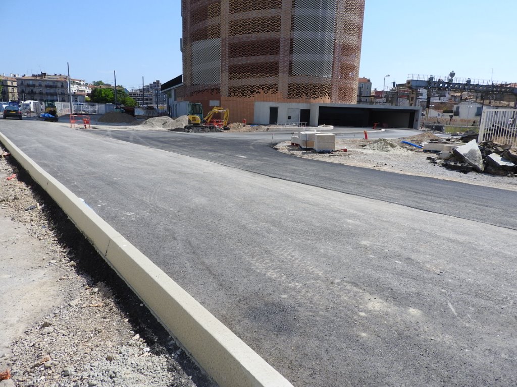 Aperçu de l’entrée et de la sortie principales du parking silo Le Nouveau Saint-Roch depuis la nouvelle voie routière construite à l’intérieur de la ZAC Le Nouveau Saint-Roch, le dimanche 24 mai 2015. Copyright : Anje34