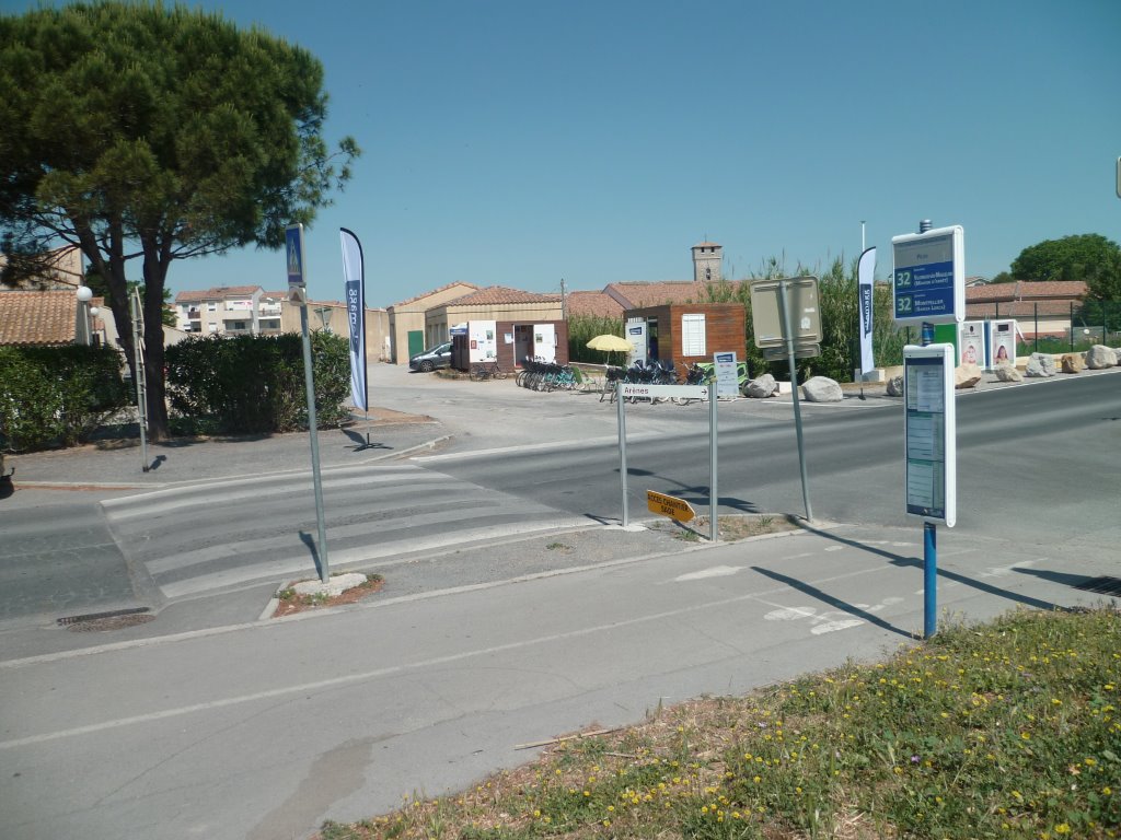 A Villeneuve-lès-Maguelone, l’arrêt « Pilou » de la ligne 32 TaM et la station Vélomagg’ plage photographiés le samedi 30 mai 2015. Copyright : Edouard Paris
