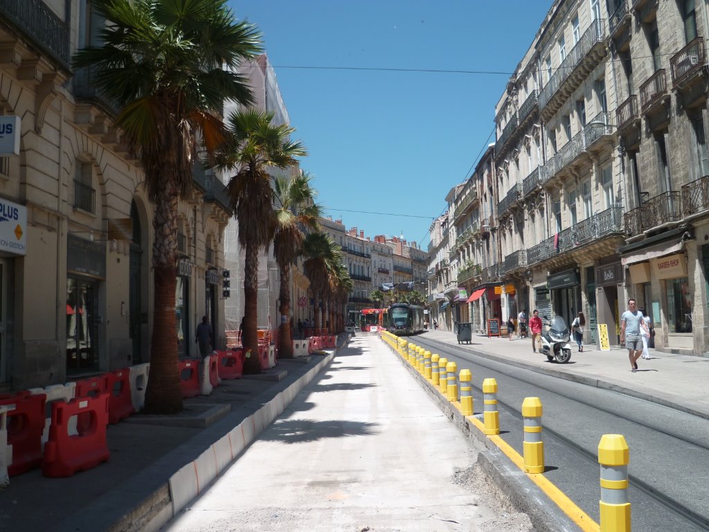 Boulevard du Jeu-de-Paume à Montpellier, entre la place Edouard-Adam et la rue André-Michel, la dalle de béton sur tapis anti-vibratile de la plateforme de la future voie descendante de la ligne 4, réalisée il y plus de deux ans déjà, a été mise à jour. Photo prise le vendredi 5 juin 2015. Copyright : Edouard Paris